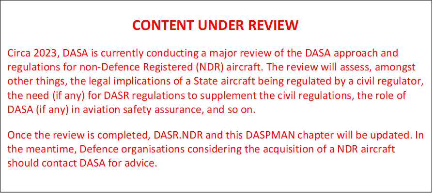 6.1.3.3 This chapter guides Defence’s aircraft acquisition organisations and Military Air Operators through the aviation safety requirements and recommended practices during the acquisition of an NDR aircraft, but only to the extent, that DASA is involved in the process.