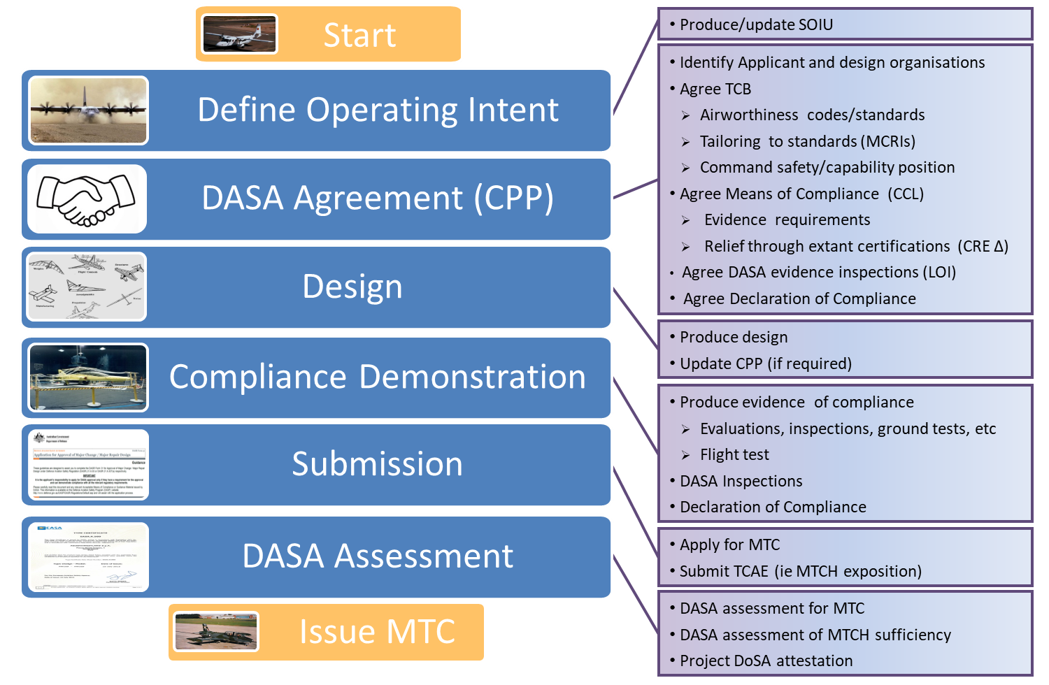 6.1.2.83 The fourth step, Compliance Demonstration, is where the MDO produces evidence that their design meets the DASA-agreed TCB. This step may require DASA approval of an MPTF to enable flight testing if the aircraft is already on the Defence Register. The MPTF is explored later in this section.