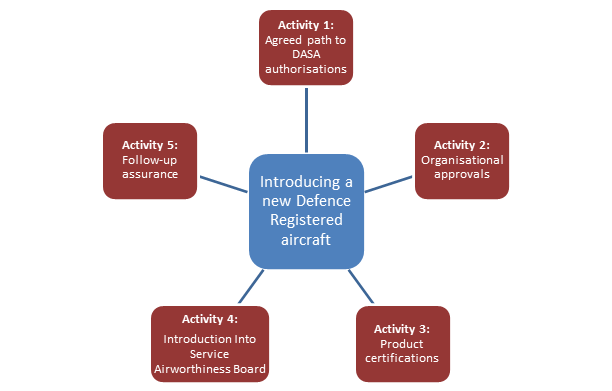 6.1.2.5 For a new Defence registered aircraft to operate, Command must ensure it is safe for flight. Command achieves this by ensuring the aircraft are designed, constructed, maintained and operated to approved standards and limitations by competent and authorised personnel acting as members of an approved organisation. In turn, if suitably assured of safety, DASA may issue a range of authorisations. Depending on the acquisition and support arrangements, this can extend to 12 different types of organisational, product and personnel authorisations, as follows: