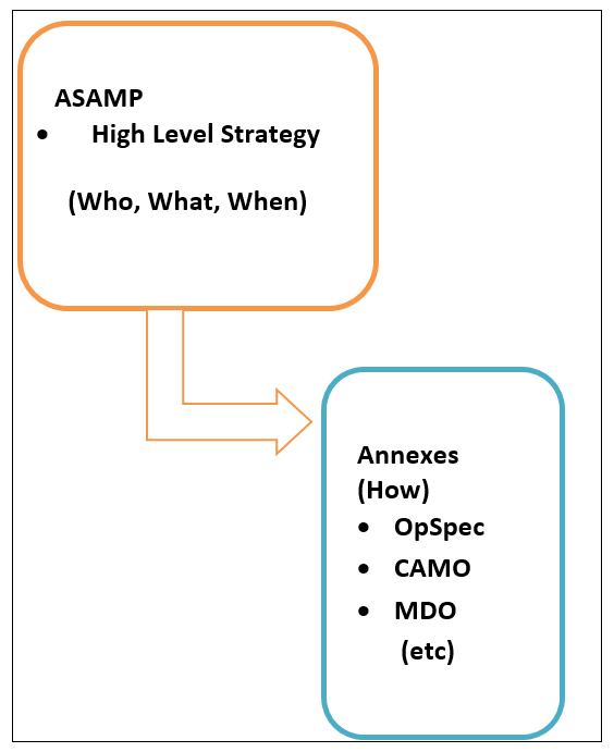 The ASAMP should describe the overarching aviation safety acquisition strategy and bring together the planned outcomes of the operational, technical, logistic and safety management activities. The ASAMP needs to describe arrangements that will support IIS and all aviation safety activities required to realise the scope of operations described in the SOIU.