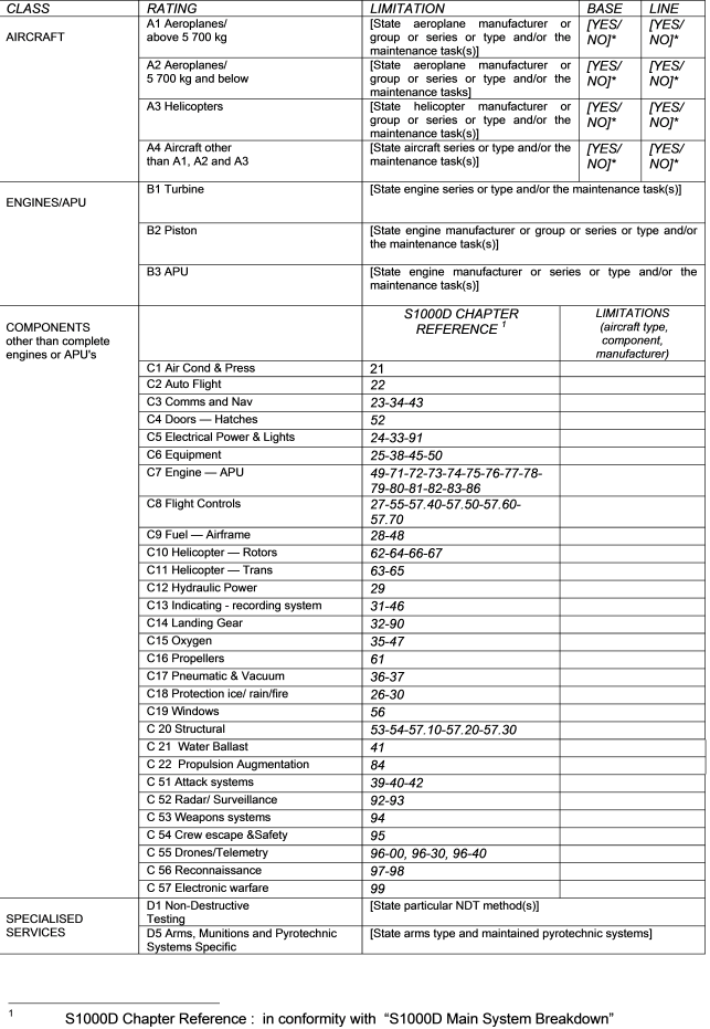 Table 1 outlines the full extent of approval possible under DASR 145 in a standardised form. A maintenance organisation must be granted an approval ranging from a single class and rating with limitations to all classes and ratings with limitations.