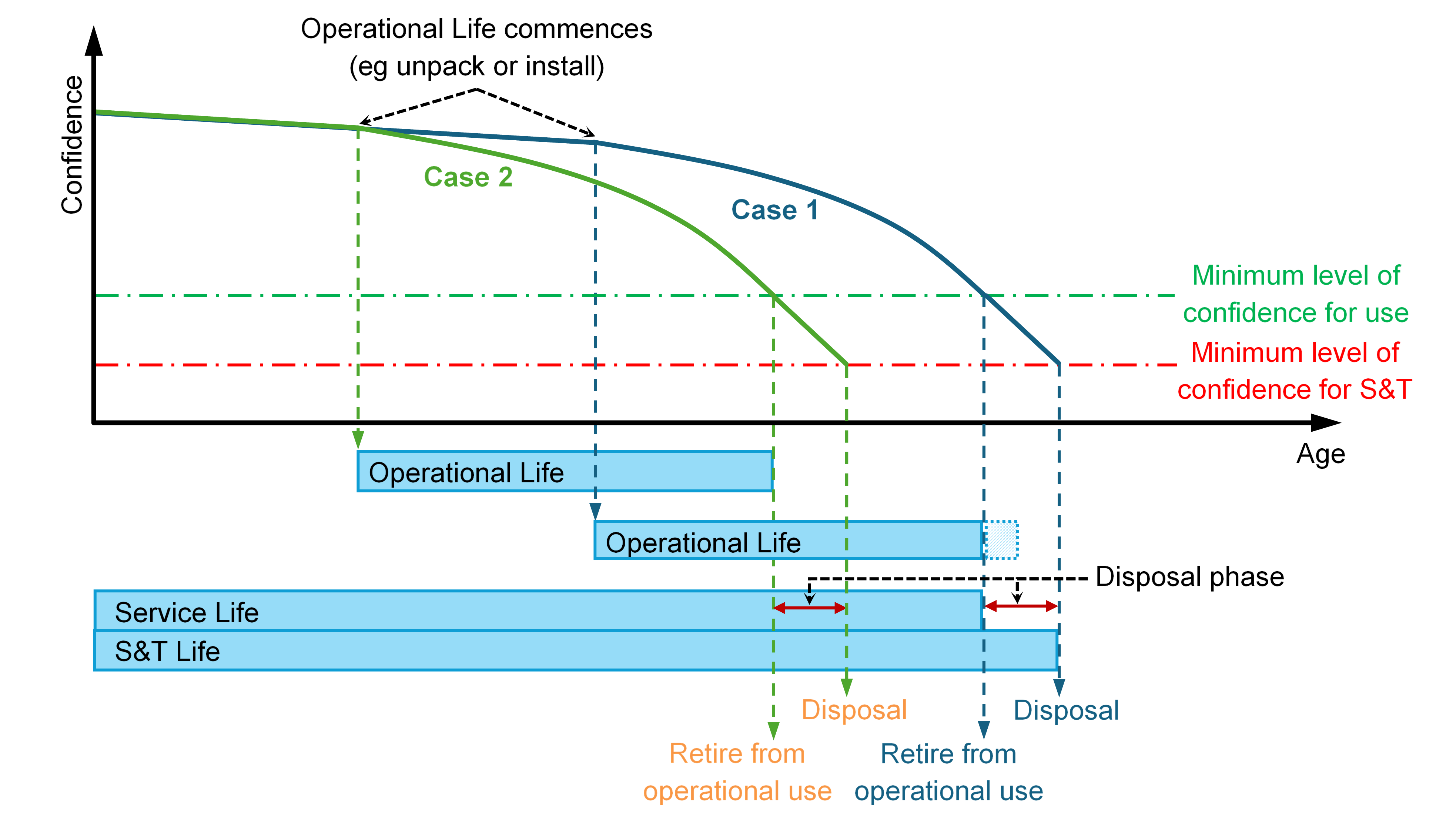 4. These EO lives are shown diagrammatically in Figure 1, which illustrates two scenarios for the same EO item. The start of the S&T Life and Service Life is typically based on the Date of Manufacture. In Case 1, the Operational Life starts later in the lifecycle, and the Service Life ends up limiting the life of the item before the disposal phase starts. In Case 2, the Operational Life starts earlier and ends up limiting the life of the item. DEOP 101 Regulation 2.5 Explosive Ordnance Life and DEOP 102 Part 2 Chapter 10 Determine Life provides further information on EO lifing.
