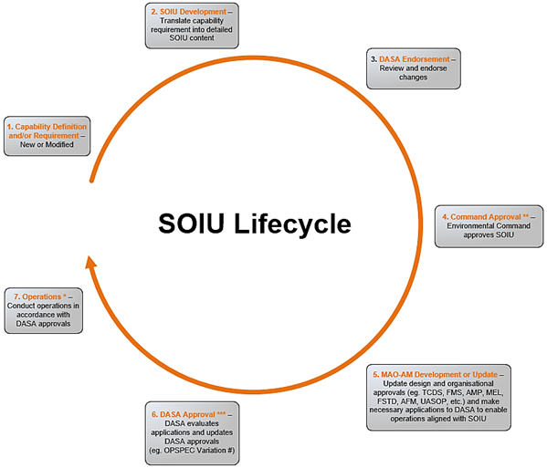 The SOIU is subject to regular variation, due to changes in intended aircraft capability, usage or operating environment. Amendment of the SOIU triggers a cascade of stakeholder actions to implement revised capability and seek a range of DASR authorisations. Figure 2 depicts the SOIU lifecycle.