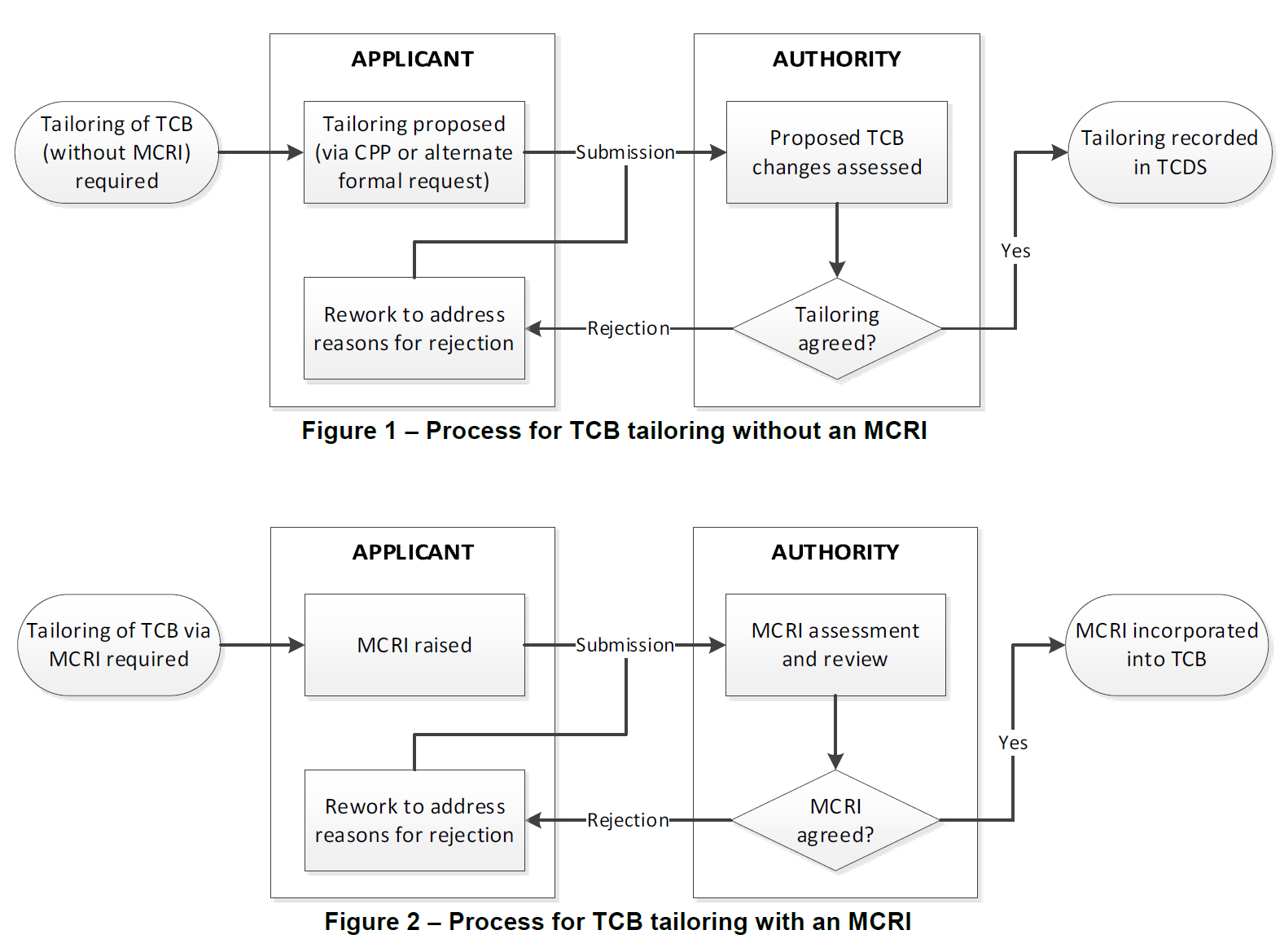 TCB tailoring (either with an MCRI or without) must be agreed prior to submitting a declaration of compliance for the relevant certification approval. A declaration of compliance must be made against the approved TCB, therefore if there is outstanding tailoring that has not yet been agreed, compliance cannot be declared. The following flowcharts show the process for gaining agreement to TCB tailoring either with or without an MCRI.