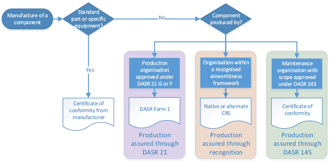 7.1.2.11 DASR make provision for DASA to issue a Military Production Organisation Approval (MPOA) to an organisation when assured they have the ability to manufacture aircraft parts and appliances in conformity with approved data. DASR also make provision for Defence to accept an aircraft produced under the systems of a DASA-recognised CAA/MAA. This latter approach is used for most new Defence aircraft.