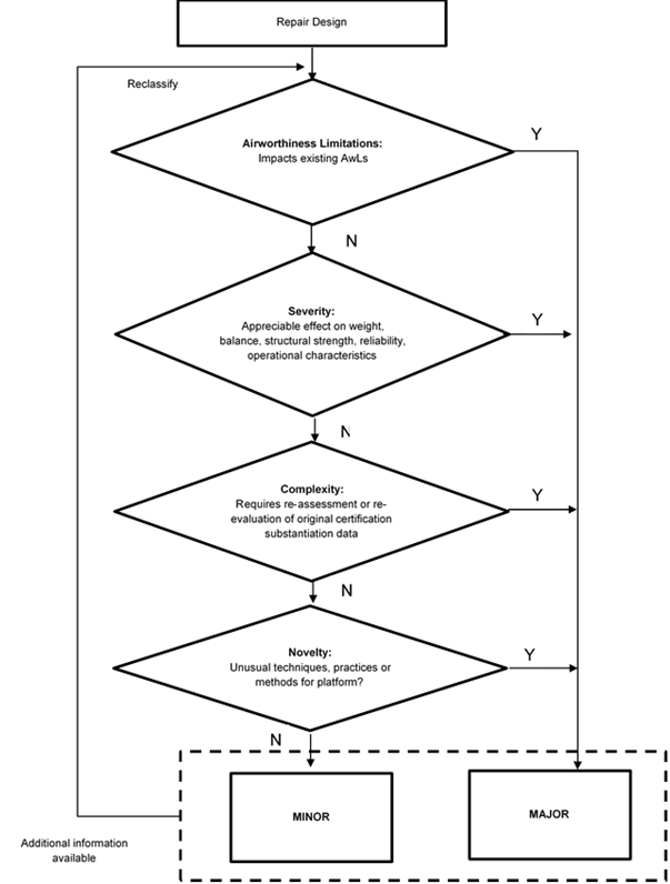 7.1.2.16 Throughout an aircraft’s life, degradation (damage) of the systems/structures integrity supporting safe flight may be compromised through direct (accidental impact and battle damage) overload, or insidious (fatigue, corrosion, moisture ingress, dis-bond, ultraviolet light etc) environmental sources. Repairs are those actions developed and implemented to restore damaged products to a suitably airworthy state. Similar to aircraft design changes, aircraft repairs are classified under DASR as Minor or Major, must be designed by a MDOA or other organisation agreed by DASA, and may be subjected to a proportionate level of DASA independent assurance.