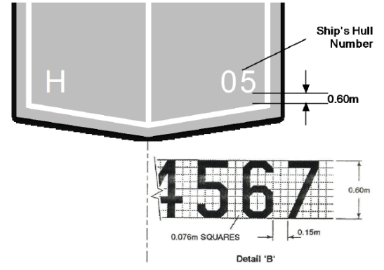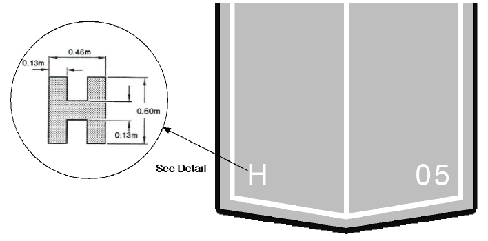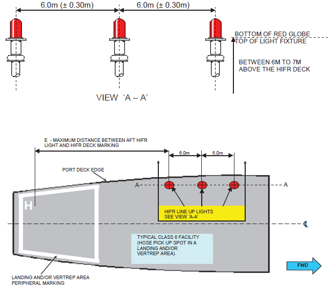 4.150. HIFR heading lights shall be installed as far to port as feasible. All three lights shall be the same distance from the ship’s centreline and shall be simultaneously visible to the pilot during the refuelling phase of the HIFR operation. The pilot is positioned opposite the hose pick-up spot at approximately 9 m to the port side of the ship at a height of 18 m. All three HIFR heading lights shall be the same distance above the ship’s base line. All HIFR heading lights shall be installed between 6 m to 7 m above the HIFR deck.
